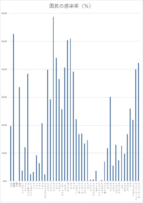 ちなみにコロナ禍初期の被害が大きかった国々の感染率はイタリアで40%、フランス59%、イギリス36%、ドイツ40%ほどです。大きく報道された合衆国やインド・ブラジルは実数こそ巨大でしたが人口も多いので、それぞれの感染率は30%、3%、18%ほどということになります。